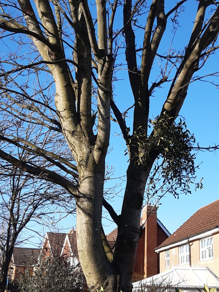 Speaking of a moth, which having a bit of a lisp I sometimes lapse into, my moss list increased to six and I have a few sprigs of other mosses laid around in bags which could double that total for March if I can identify them. Mosses might be getting the quantity up but for quality my best plant, in fact my best wildlife sighting of any type for a couple of years, was Mistletoe. Mistletoe isn’t supposed to be up here; the definitive “Flora & Vegetation of County Durham” only lists 12 records since 1950 of which only five remained, all on apple trees and all in parks and gardens, at the time of its publication in 1988. The tree that this Mistletoe was on wasn’t even planted in 1988; it was just a Norway Maple standard, planted on a road verge, an unusual host in terms of its age and species. The location was even more unexpected. It was just around the corner from my house; 258m away to be precise, I measured it on Google Earth and somehow I’d never seen it before. I can’t even claim credit for the discovery; it was my wife who spotted it. In my defence I only go that way occasionally and then only for a run where I usually take a sharp right 67m before the tree.