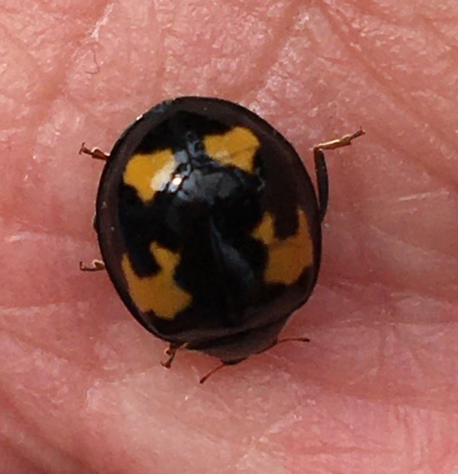 In spite of seeing some fairly spectacular species and some that I had never seen before, my species of the month ended up being one that I had seen loads of times already, as its larvae are dotted all around my vegetable patch, the uber-invasive, Harlequin ladybird. It comes in many guises; yellow, orange or red with anything from 0-21 spots, or even shiny black with two or four, red or orange blotches. The one that ended up in our bedroom had blotches that had fused to form a Rorshach blot on its back, which I swear looks like the Batman symbol. I wonder what that says about me?